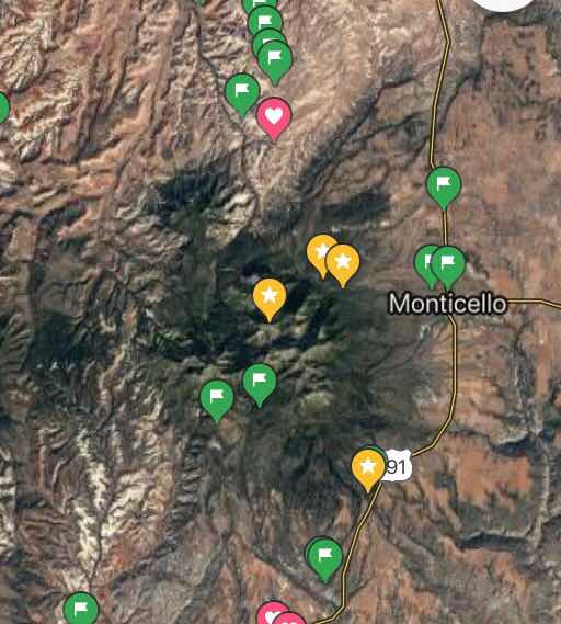 “The Abajo Mountains, known locally as the Blue Mountains or The Blues, is a small mountain range west of Monticello, Utah, south of Canyonlands National Park and north of Blanding, Utah. The mountain range is located within the Manti-La Sal National Forest.” (WIKI Internet Lookup)